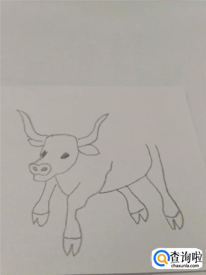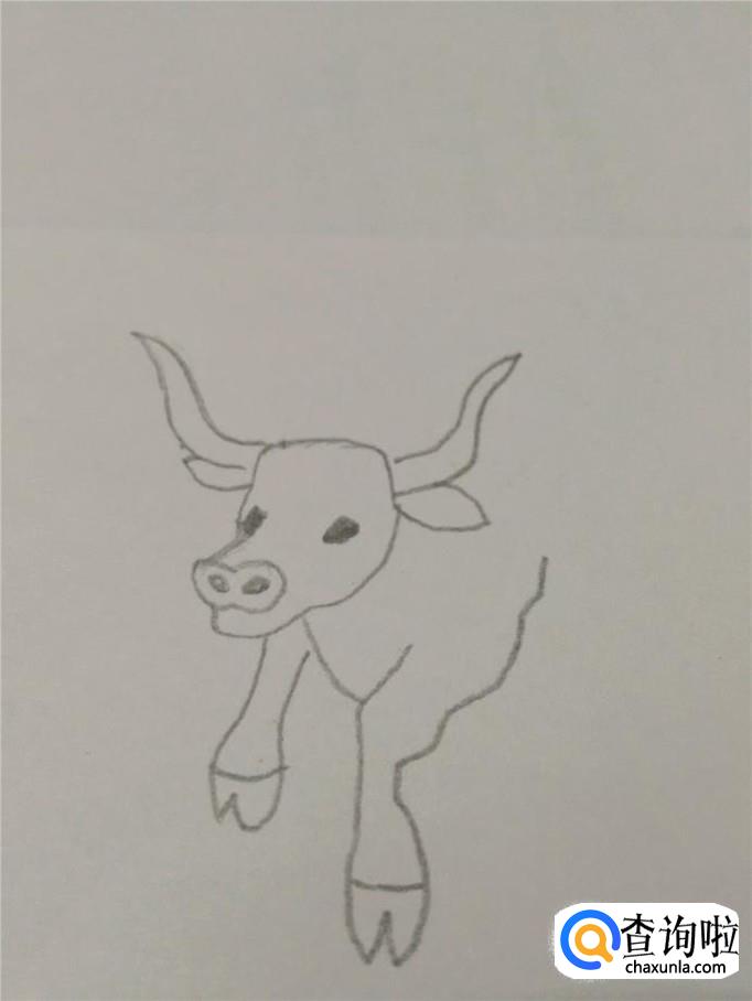 在头的下方,画两只前腿,前腿上方细,越到蹄子部分越宽,蹄子要画成两半的,并在蹄子上面画一条横线,这是蹄子和腿的分界线。在两只蹄子之间,画一条斜线,表示前胸。