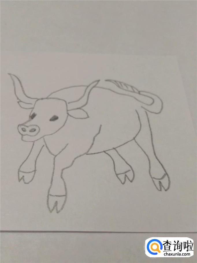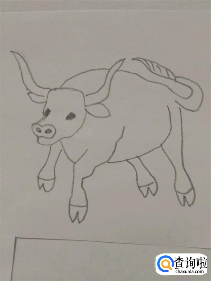 在最右端的那条后腿上面画一条甩起来的尾巴,表示小公牛正在准备往前冲,然后从尾巴往左画一条弧线,表示弓起来的背,到这里,小公牛就画完了。