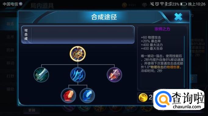宗师之力;物理攻击+60,暴击率+20%,最大法力+400,最大生命+400,被动技能:强击,使用技能以后2秒提升自身8%移动速度,使下一次普通攻击造成1.0*物理攻击的物理伤害。我就是喜欢暴力出装,提高暴击,默默地我不说话!