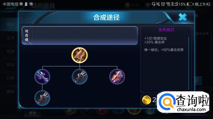 无尽战刃:物理攻击+120,暴击率+20%,被动技能:暴击效果+50%。这件装备对于那些按捺不住自己杀人冲动的朋友们无疑是最好的帮手!如果铭文跟的上的话,就用普攻打死残血不是事啊!