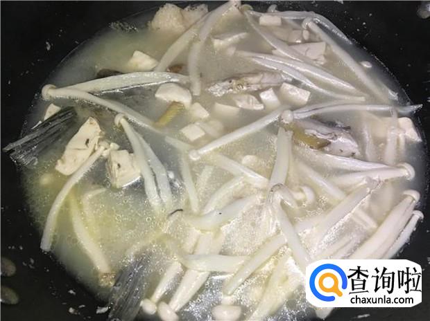 大火炖,大概炖15分钟左右,等鱼骨头差不多炖熟了,再放入海鲜菇煮,海鲜菇很好熟的。