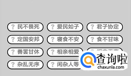 第400关:民不畏死、爱民如子、君子协定、定国安邦、寝食不安、食不甘味、善罢甘休、相亲相爱、相安无事、杂乱无序、闲杂人等。