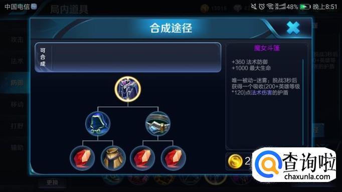 法术防御+360,最大生命+1000,被动技能:迷雾——脱离战斗3秒后获得一个吸收(200+英雄等级*120)点法术伤害的护盾。