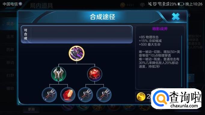 物理攻击+85%,冷却缩减+15%,最大生命+500,被动技能:切割,增加(50+英雄等级*10)点物理穿透。被动技能:残废,普通攻击有30%机率降低敌人20%移动速度,持续2秒。