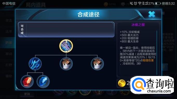 冷却缩减+10%,最大法力+500,物理防御+200,最大生命+800,被动:强击,使用技能后,5秒内下一次普攻造成30%范围的减速,与(150+英雄等级*20)点的物理伤害,冷却时间1秒。