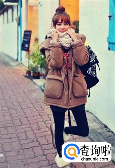 这是我现在的搭配,天气冷了,一件宽松短款的面包服,搭配一条加绒打底裤,喜欢穿裙子的,搭配一条伞裙或者包臀裙A字裙都可以,或者搭配一条小短裤,脚蹬一双雪地靴,特别的可爱时尚哦。