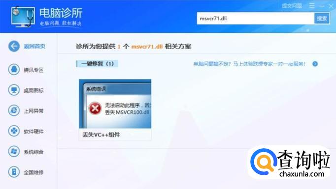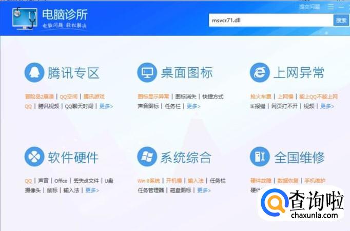 进入电脑诊所界面,在搜索框内输入 msvcr71.dll,如下图