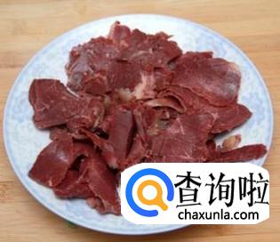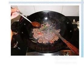 然后我们向其中加驴肉片,再加一勺豆瓣酱,爆炒。