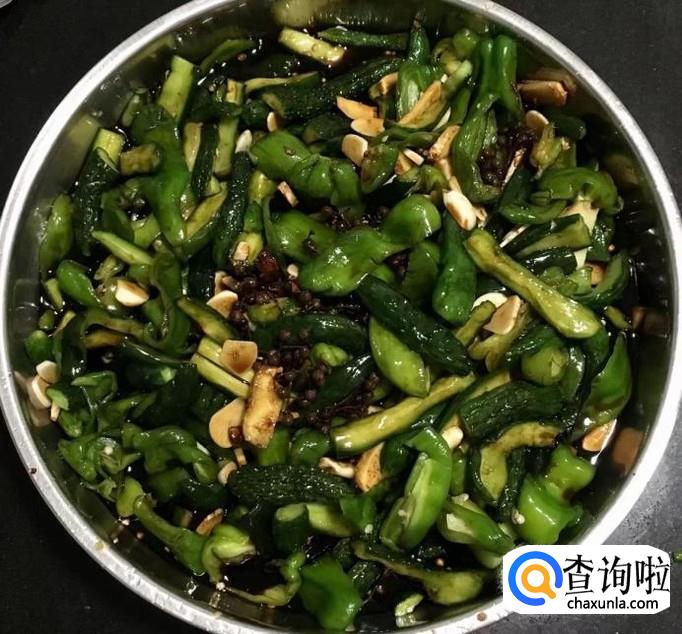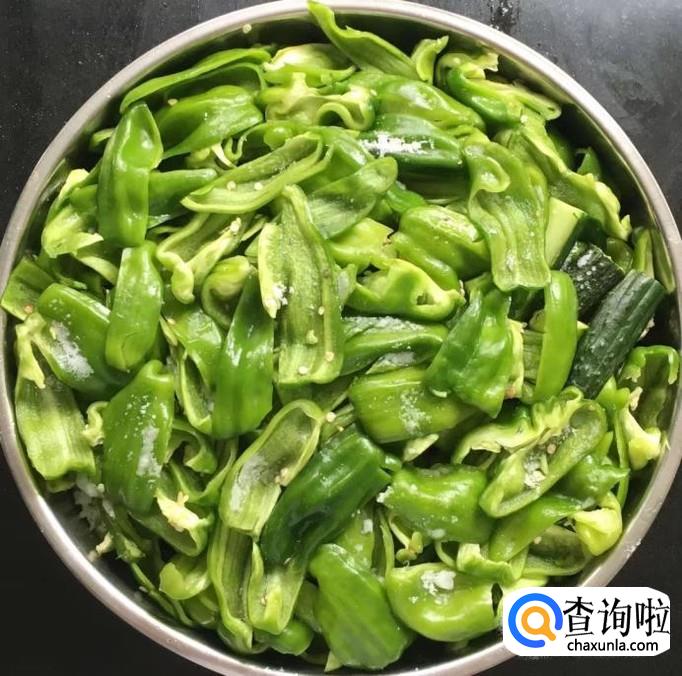 黄瓜和青椒共八斤左右清洗干净并完全沥干水分,切成条状放入盆中撒入适量的盐搅拌均匀,用重物压住去一下食材的水分