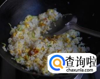 鸡蛋炒好后,加入米饭,翻炒。