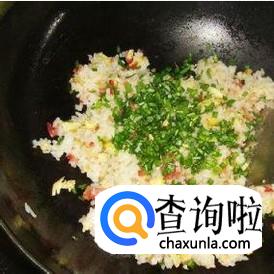 鸡蛋与米饭混合均匀后再炒大概2分钟,加韭菜,中火翻炒1分钟。