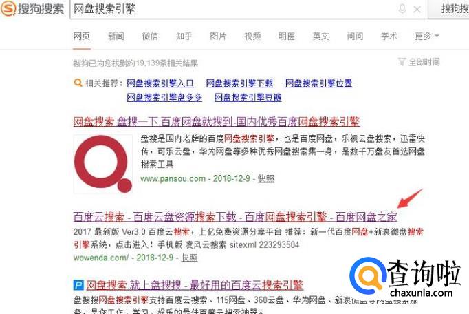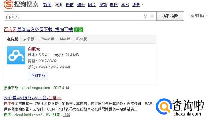 打开搜狗网页,在搜狗搜索中搜索百度云,获得百度云的官方入口。通过具有官方标识的链接地址即可进入百度云官网。