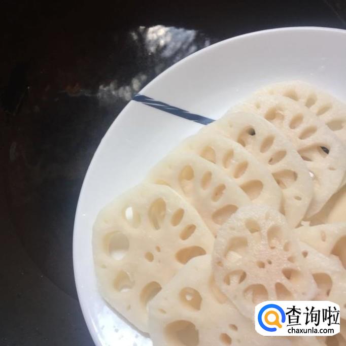 然后锅中放入适量的清水,待水烧开倒入莲藕煮两分钟,捞出沥干,如下图所示。