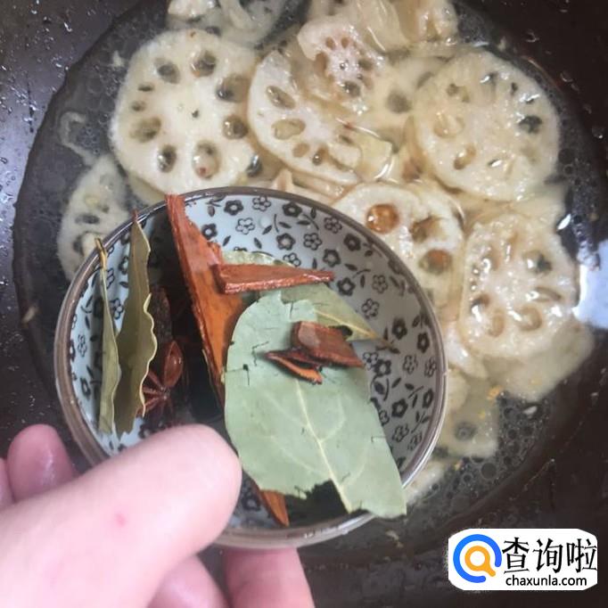 接着往锅中加入适量的清水,倒入桂皮,八角,香叶,如下图所示。