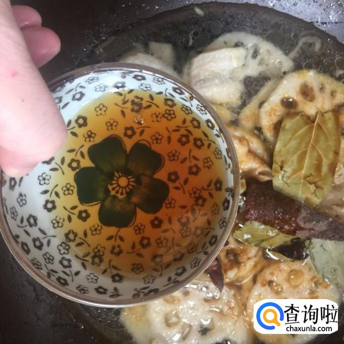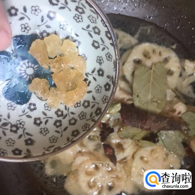 然后往锅中加入适量的冰糖和酱油,如下图所示。