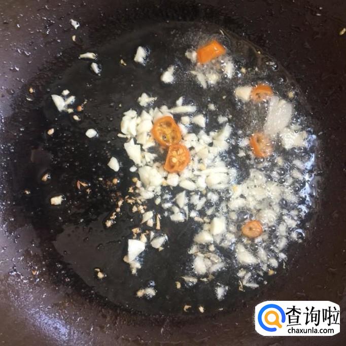 接着往锅中加入适量的食用油,待油冒烟,倒入蒜蓉和黄辣椒爆香,如下图所示。