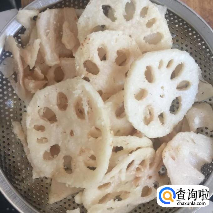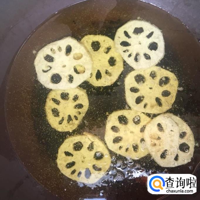 然后锅中放入适量的食用油,待油冒烟,倒入莲藕片炸至两面金黄捞出控油,如下图所示。