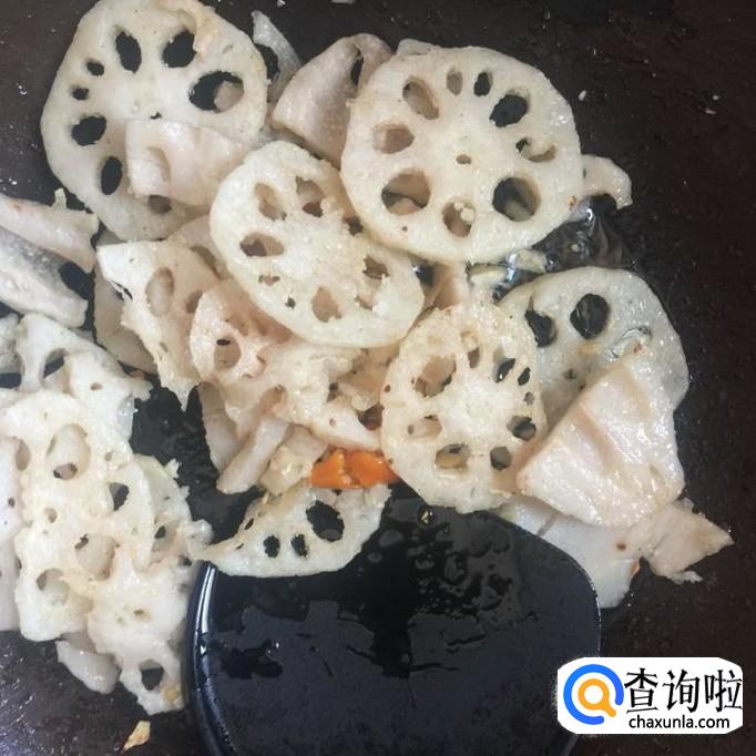 然后把藕片导入锅中翻炒两分钟,如下图所示。