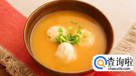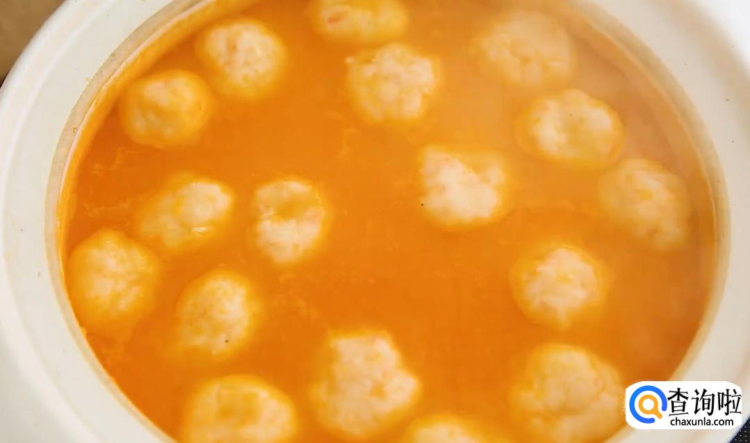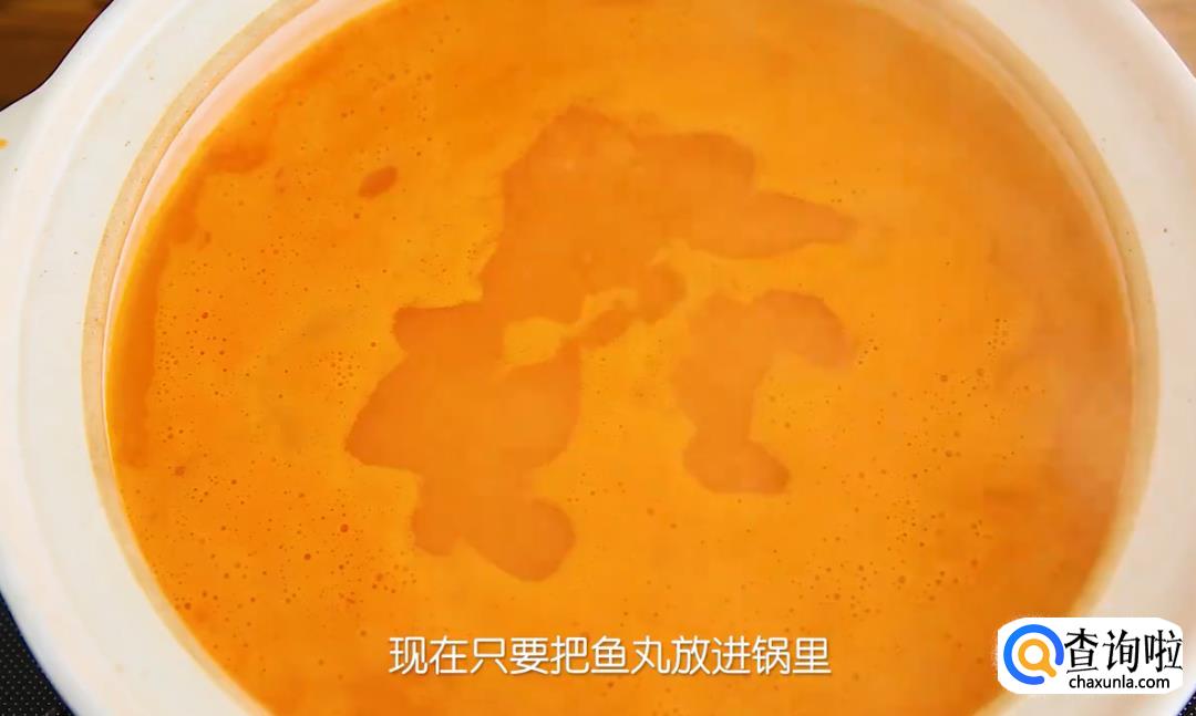 把番茄糊放进鸡高汤里,加盐调味,再加少许糖提鲜,香浓的番茄汤底就做好了。现在只要把鱼丸放进锅里,大火煮开,番茄鱼丸汤就做好了。