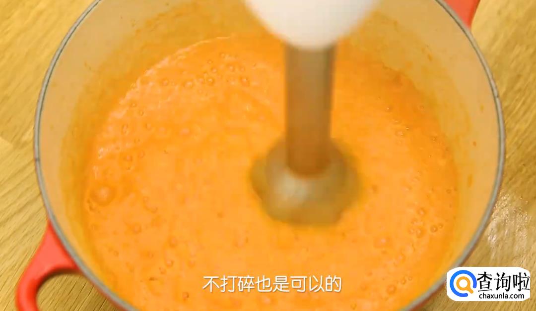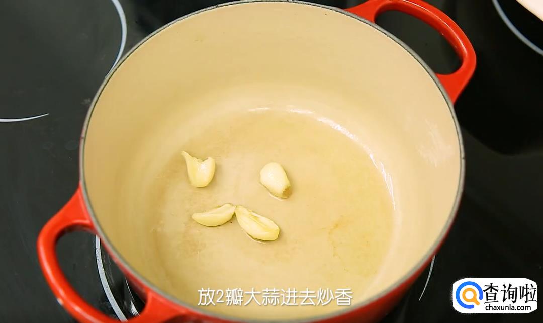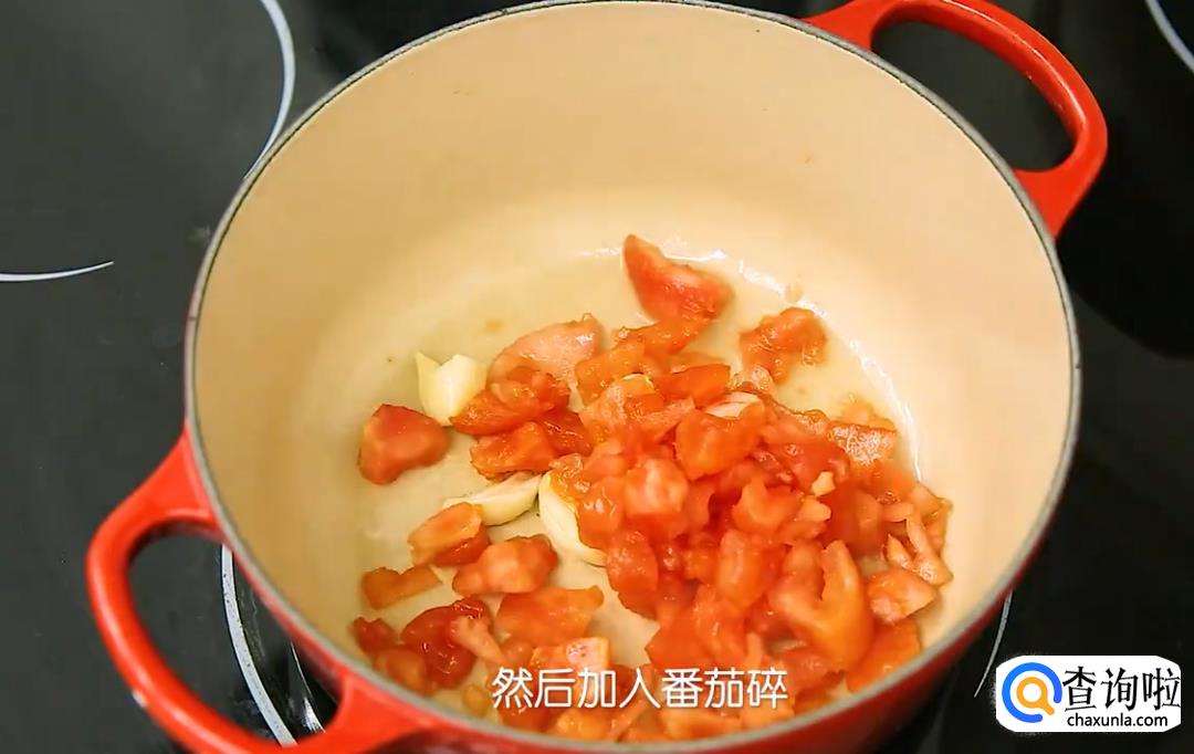 在烧热的锅里加一大勺油,放2瓣大蒜进去炒香,然后加入番茄碎,炒到番茄出汁,仔用料理棒打成番茄糊(如果你没有料理棒,不打碎也是可以的。)。