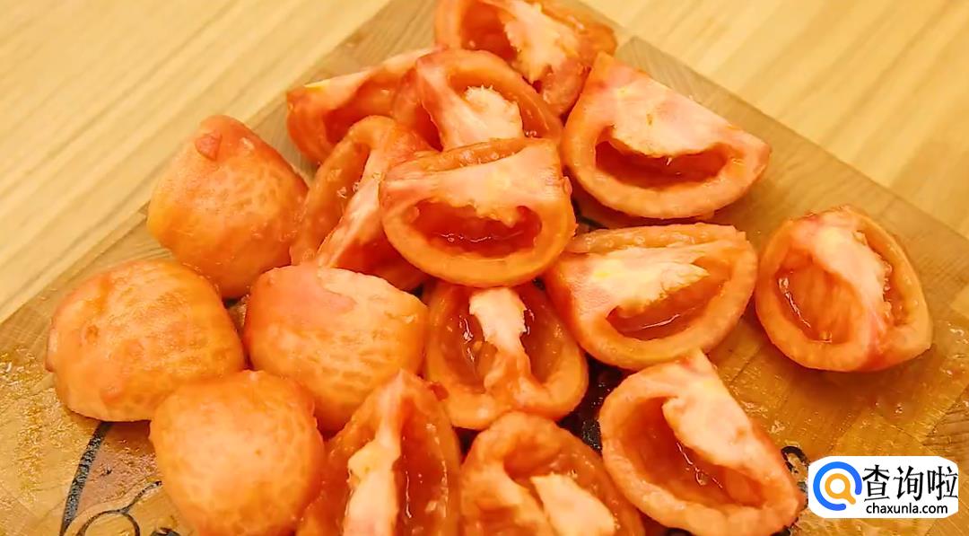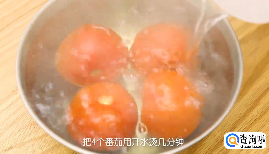 取4个番茄,用开水烫几分钟后,剥去外皮。去掉番茄籽和番茄蒂,将其切碎。