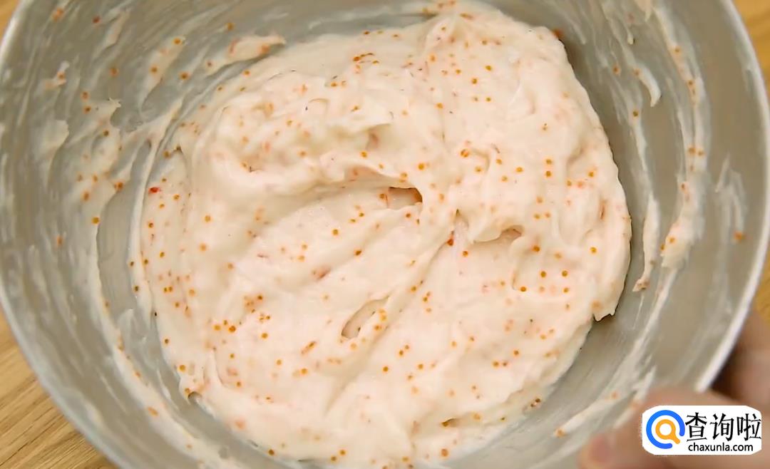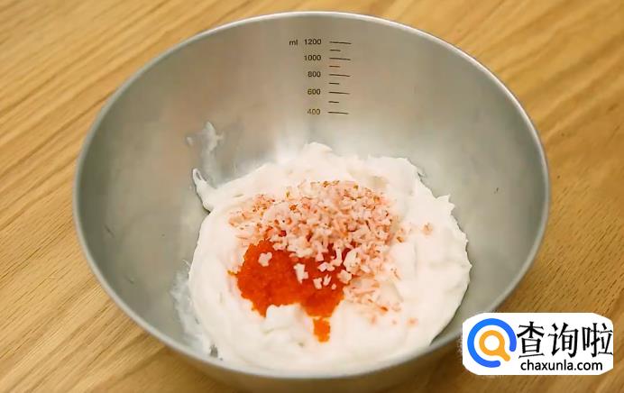 取出鱼肉泥,放一大勺鱼籽,一大勺切碎的蟹棒,把他们拌匀。
