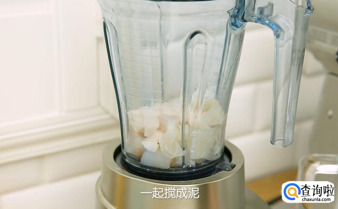 把鱼肉放进料理机里,然后再切10克猪肥肉进去,加入一大勺料酒,一起搅成泥。