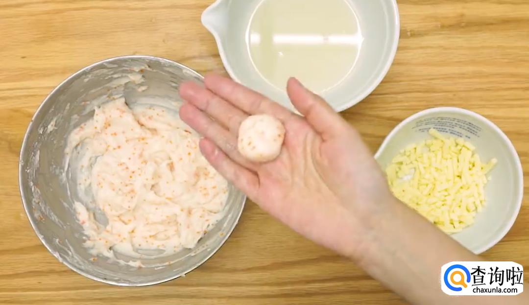 先在手上涂抹葱姜水防粘,然后取一块鱼肉,把芝士包在鱼肉中间,整形成丸子状。