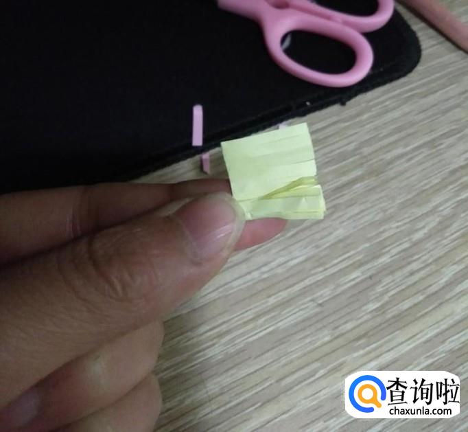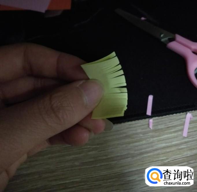 用剪刀按如下图所示的方式剪黄色的纸,然后从头至尾将其裹起来,如下图2所示,末部用胶水粘起来。