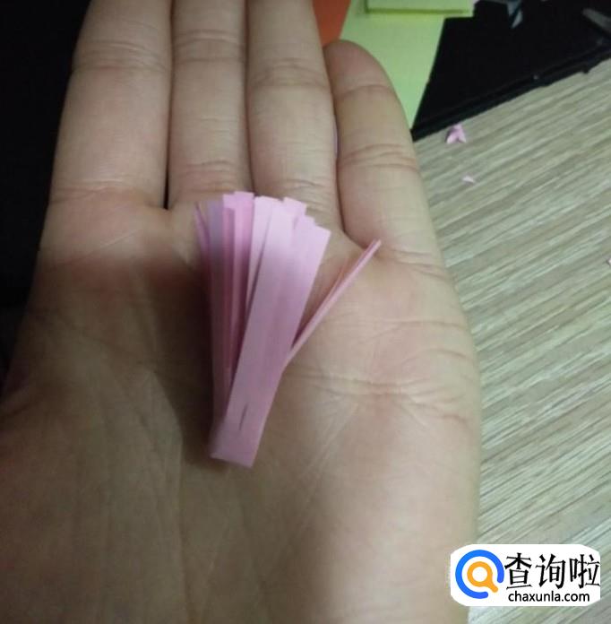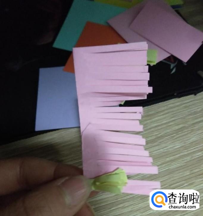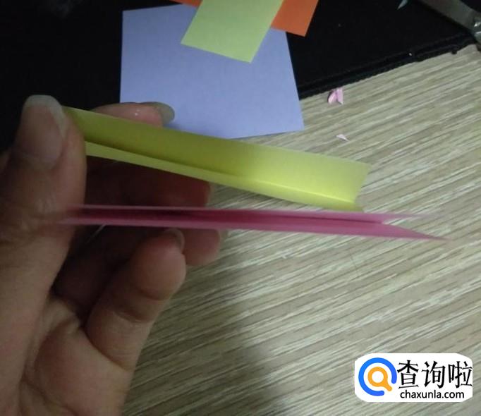 用粉色的纸包裹着黄色的纸, 如下图一,然后再将粉色的纸如图2所示的样子裹起来,完成后如图3,用胶水将其末端粘起来。