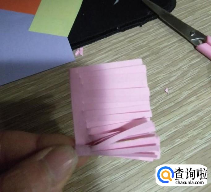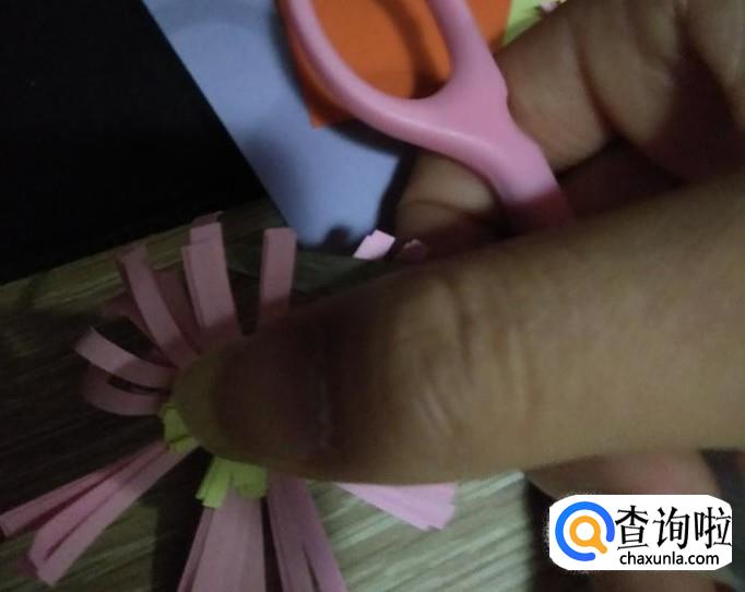 然后将花瓣放于大拇指与剪刀之间。用剪刀刮花瓣,使花瓣成卷曲状,