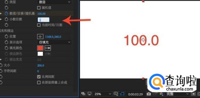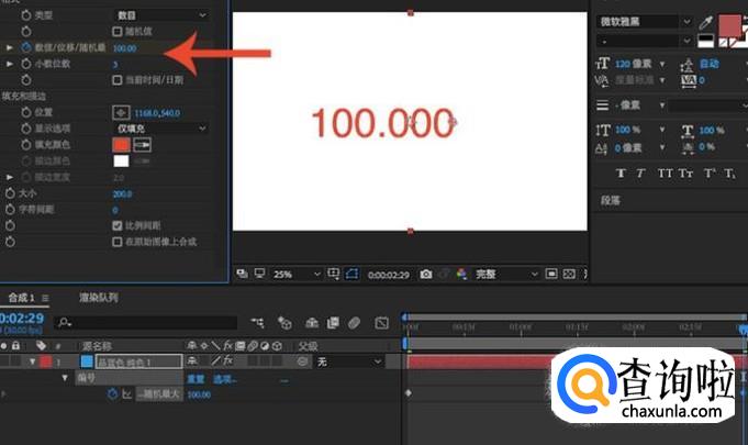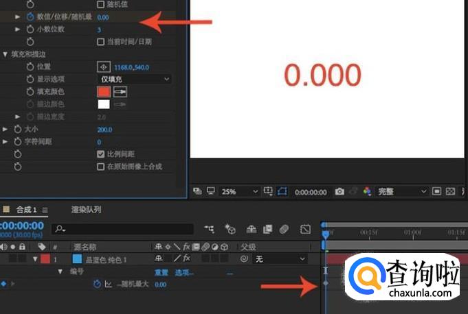 编号创建完成之后合成上就会出现数字,在开始的位置给“随机最大”打上一个关键帧,并且设置为0,表示从0开始。