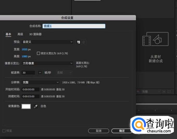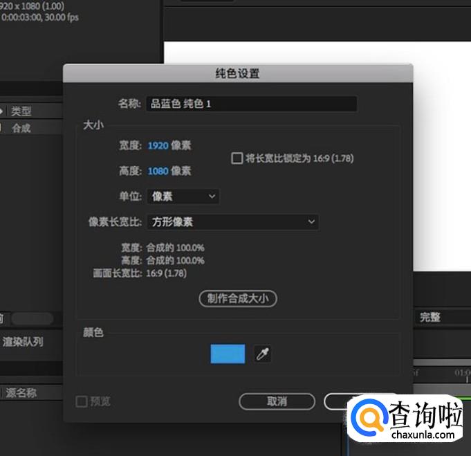 在纯色设置界面,高宽都要和合成的尺寸一样,颜色随意选择,点击“确定”即可。