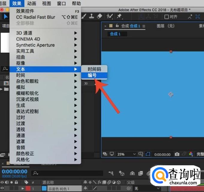 创建纯色固态层之后,点选固态层,选择在上方菜单中选择“效果-文本-编号”