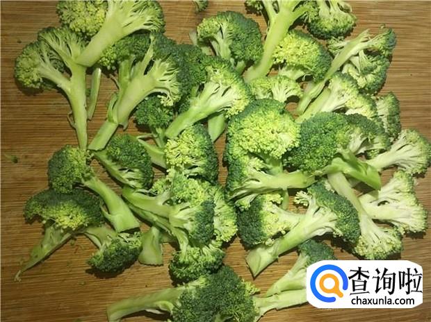 西兰花切掉根部,根部比较老,不好吃的,然后再把西兰花切小块,清洗干净。