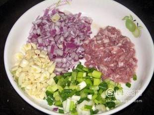 佐料生姜洋葱蒜,把生姜洋葱蒜分别剁碎,放到碗里,根据自己的口味,加入适当的量。