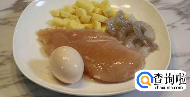虾肉鸡胸肉为原料,先把虾去皮,把肉提取出来,肌肉也清理干净剁碎。