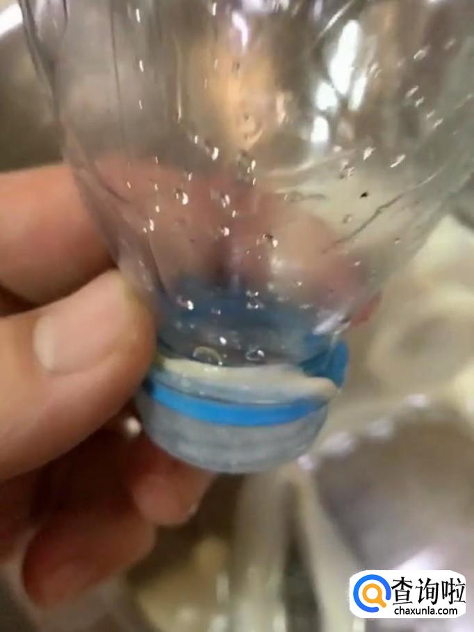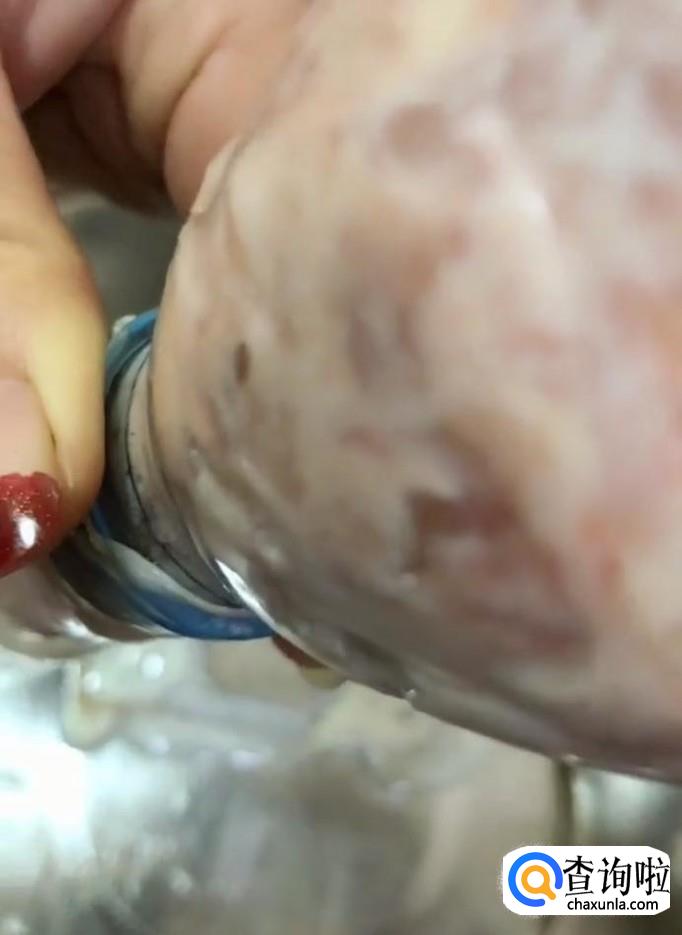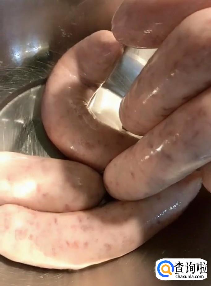 然后我们将肠衣清洗干净,一头挤扣,另一头套个矿泉水瓶,将调好的肉馅灌入肠衣中,全部做好以后,两头都挤扣挤紧备用