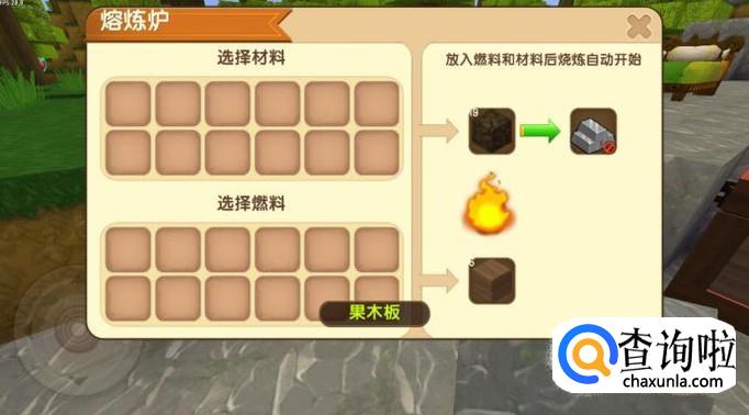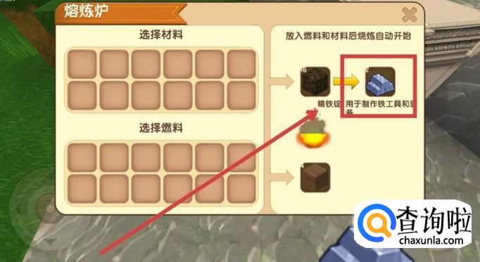 熔炼炉制作完成后,我们把铁矿石和燃料同时放到熔炼炉里,稍等一会铁锭就熔炼完成了。