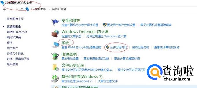 如图所示,唤出"系统和安全"选项界面。选择"系统"选项区,点击"允许远程访问"图标。