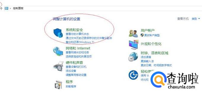 唤出"控制面板"程序窗口,如图所示。点击"系统和安全"图标,用于查看并更改系统和安全状态等设置。