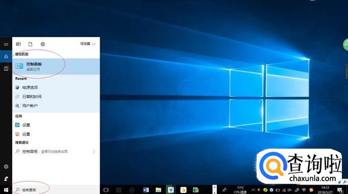 如图所示,搜索框输入"控制面板"。Cortana(小娜)显示搜索结果,点击"最佳匹配→控制面板"项。