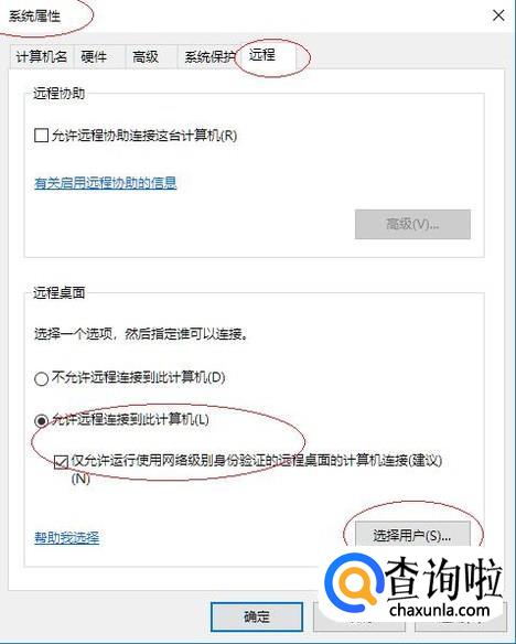 如图所示,勾选"远程桌面→允许远程连接到此计算机"单选框。勾选"仅允许运行使用网络级别身份验证的远程桌面的计算机连接"复选框,点击"选择用户..."按钮。