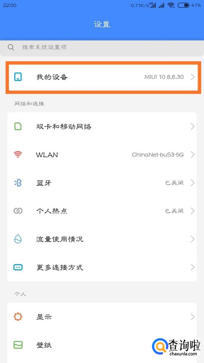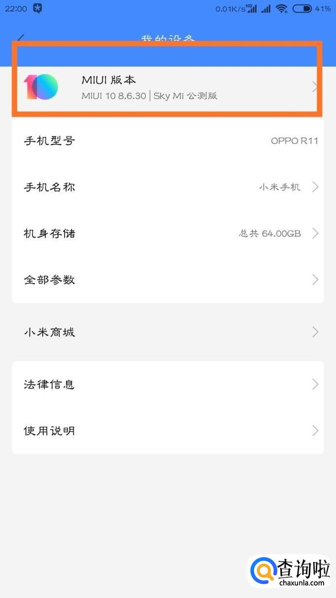点击屏幕最顶部的"我的设备",然后再点击进入"MIUI版本",即系统更新。