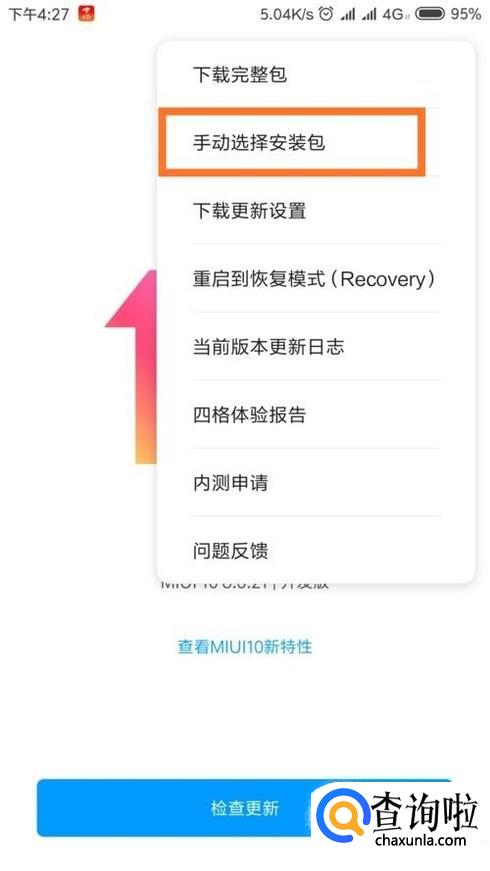 在同样的地方选择"手动选择安装包",然后在download文件夹里面选择刚刚下载的刷机包就会自动刷入。