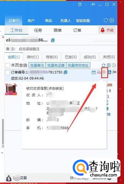 如果想要给客人核对地址,不需要打开已卖出的订单页面,直接在千牛客户端点击一下就可以发送核对地址了。如下图,点击第三个按钮会出现地址明细提示。
