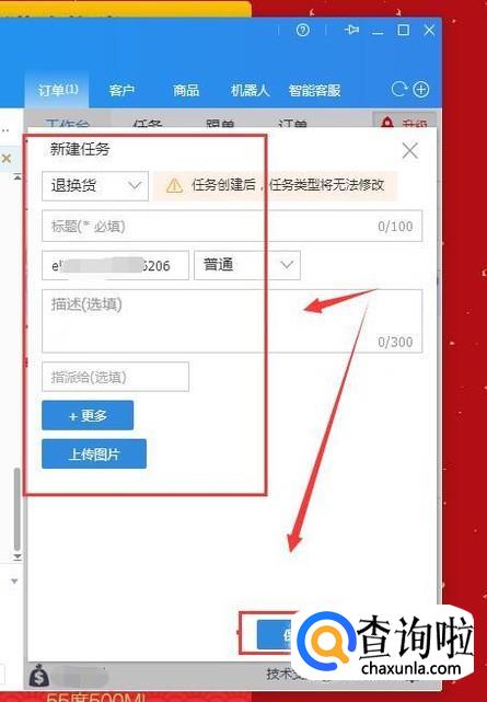 如下点击的是第一个小按钮,会打开一个新建任务的窗口,按照提示进行选择、输入、上传图片等,完成后再点击右下角的”保存”按钮进行保存。