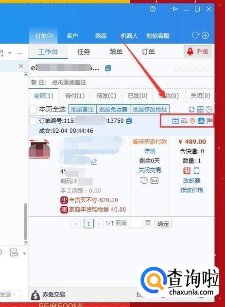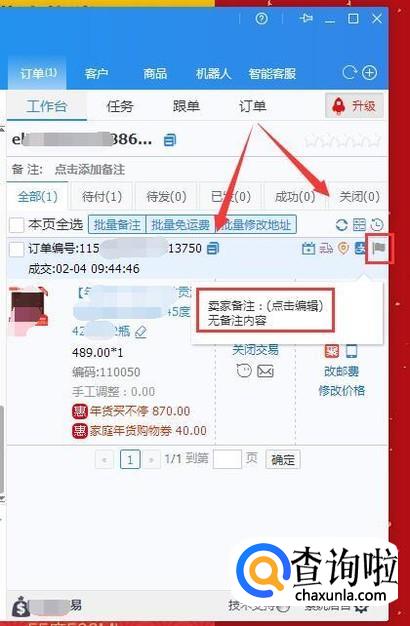 如下点击最后一个备注按钮,点击它可以直接把一些特殊信息备注到里面,这样更好的查看此订单的一些特殊情况等。