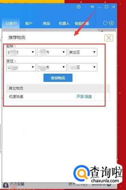如下点击的是“推荐物流”按钮,会弹出一个小窗口;按照提示选择起始与发往地址等,进行设置操作。