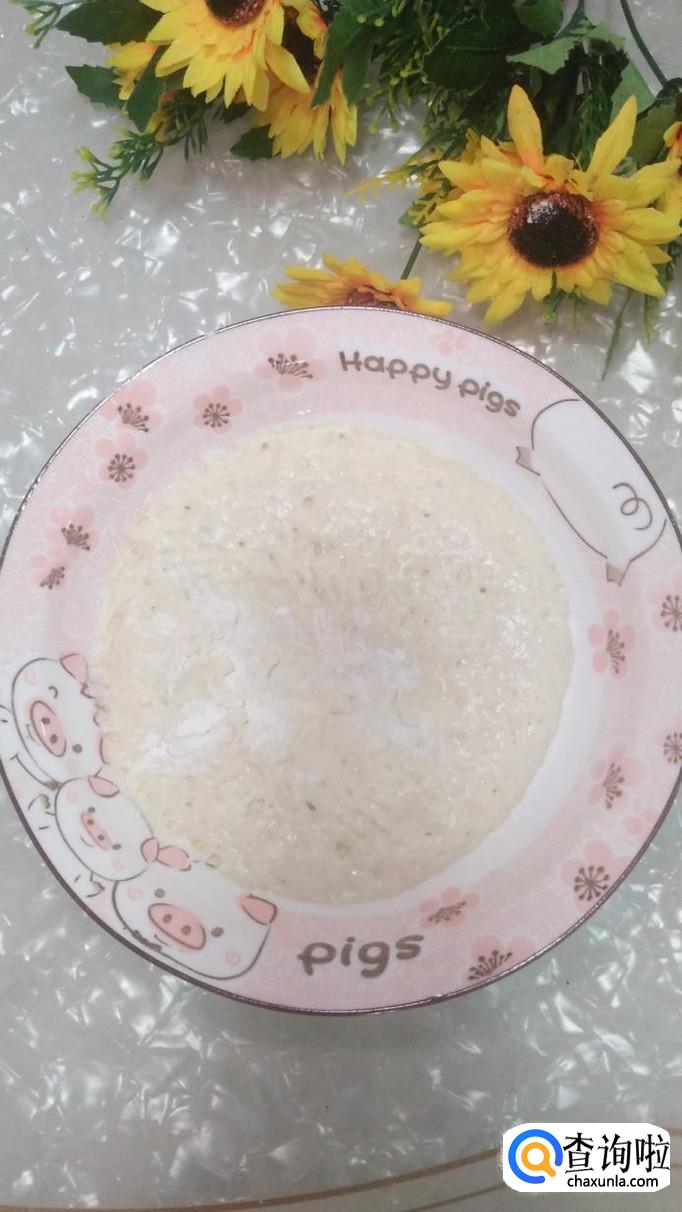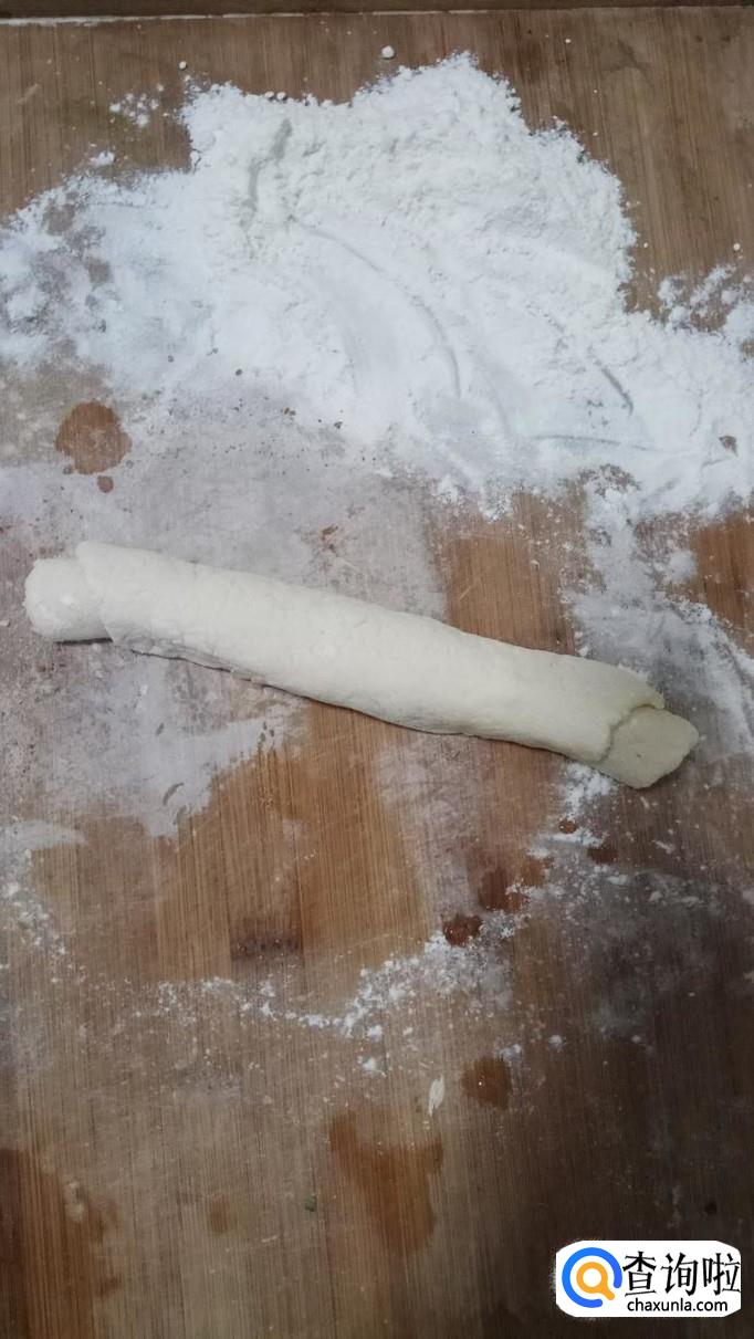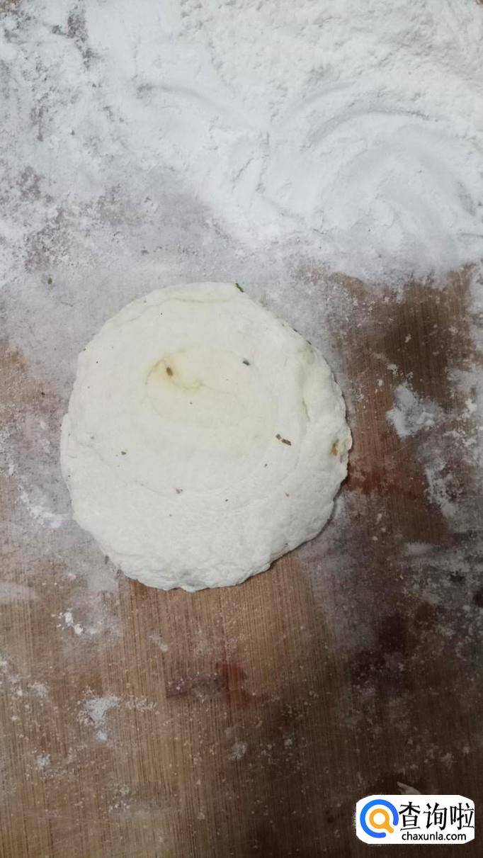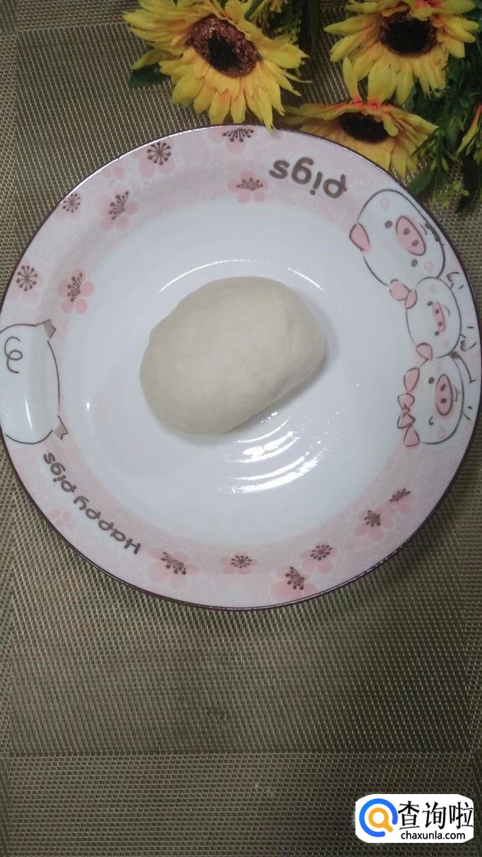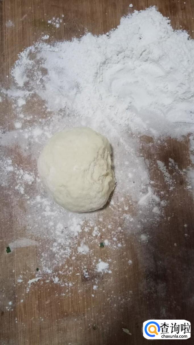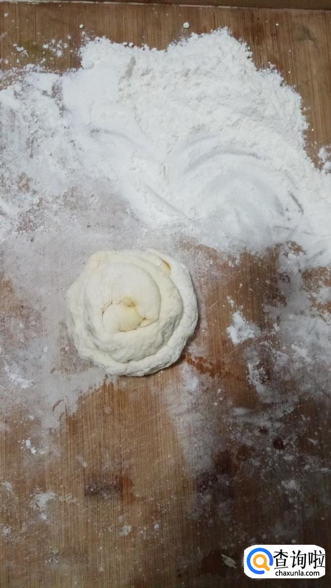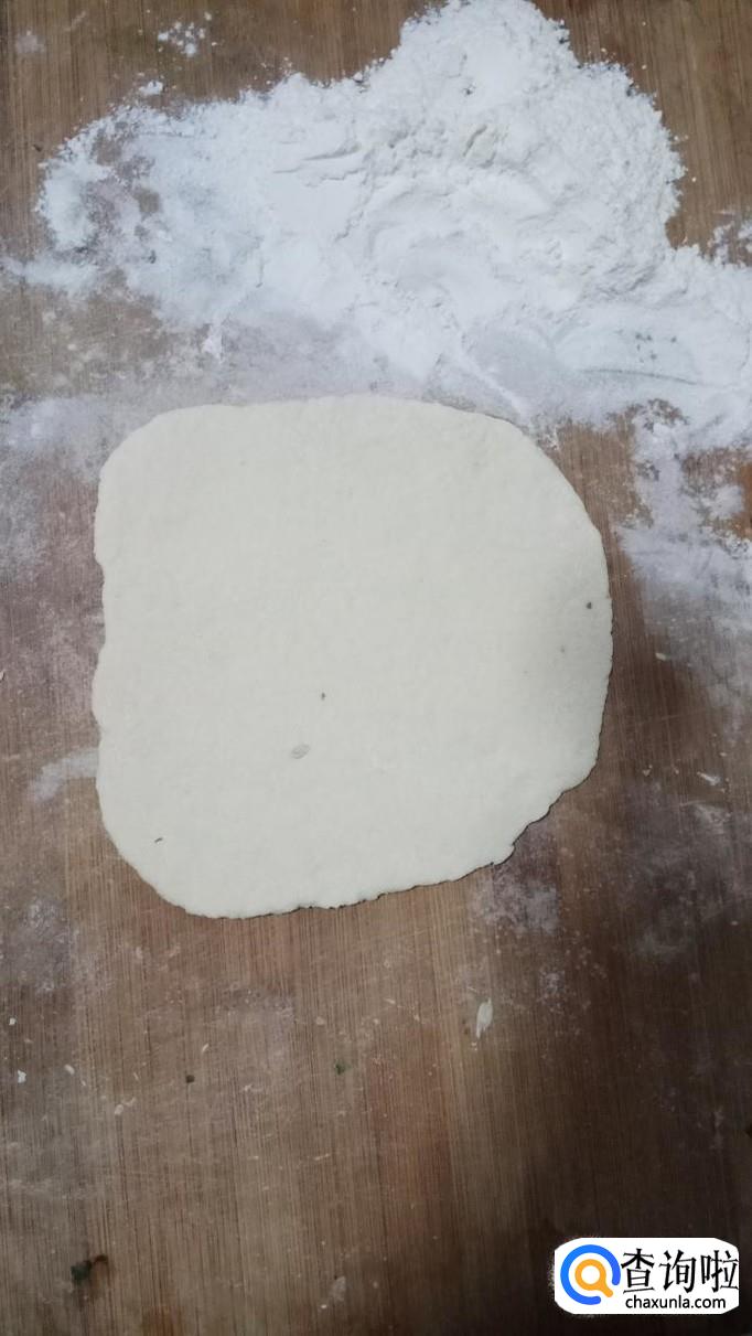 现在的天气比较暖和,两三个小时面团就发酵至两倍大了,再用手揉一下,取出适量,擀成面片,尽量做成圆形。